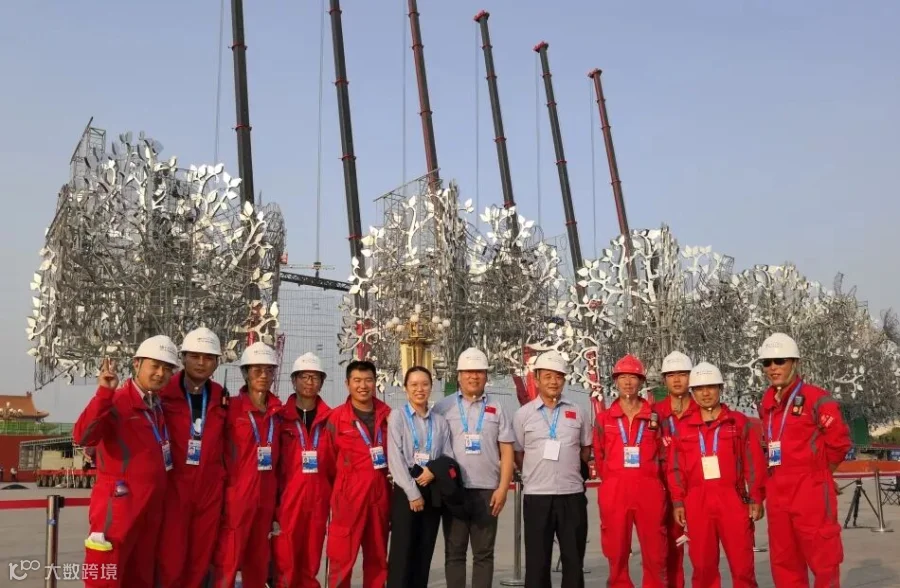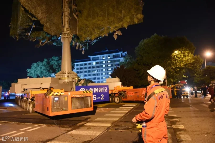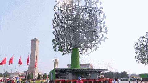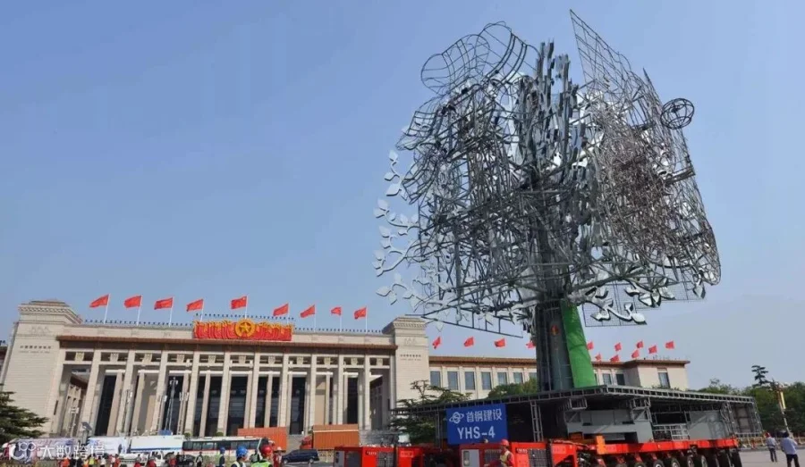 在晚会现场,细心的人们会发现每棵巨“树”都没有在天安门广场上“落地生根”,而是长在一辆辆SPMT模块平板车上。中海广瀛工程物流有限公司,作为中远海运集团在物流板块的合资企业,接到任务后迅速实施,反复计算和现场试验、校核,设计了SPMT车板双拼横向连接梁,并现场监控制造、做漆美化,加配重及卡板让树在SPMT这一个完整平台上生根,使得树车整体抗风能力可以到达20m/S。该方案获得了甲方单位及指挥部的高度认可,在经历了多次测试和专家评审会后,最终敲定中海广瀛的SPMT模块车及相应的技术保障方案实施联欢活动当晚的“栽树”任务。