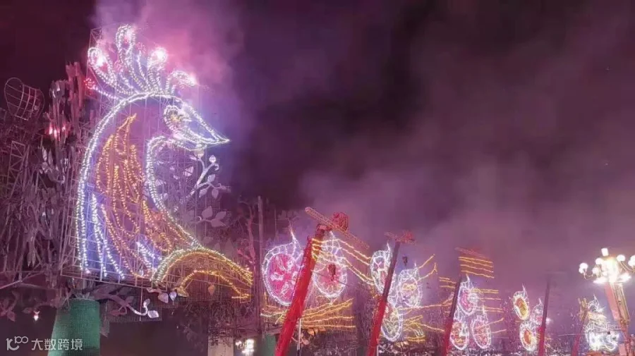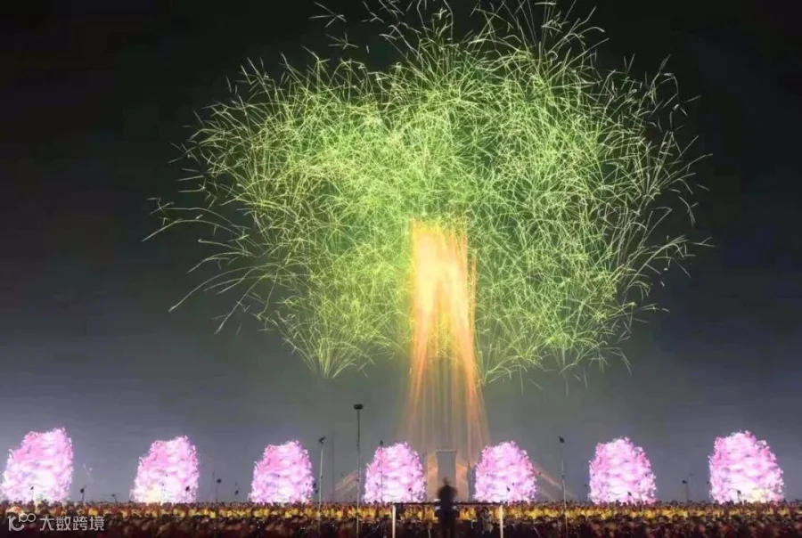 焰火树为四面体造型,一面有LED屏幕,其他三面安装烟花燃放装置,焰火树在活动中通过旋转与开合呈现了美好家园、牡丹盛开、欣欣向荣等燃放效果。