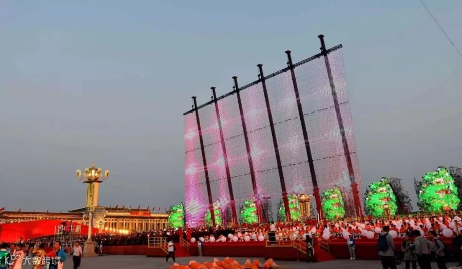 这面“五星红旗”是一张LED网幕,高73米、宽90.25米,组合前放置于3个长度31米的网幕箱内。