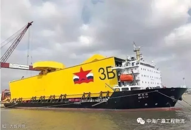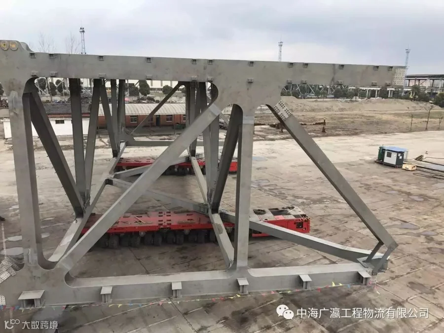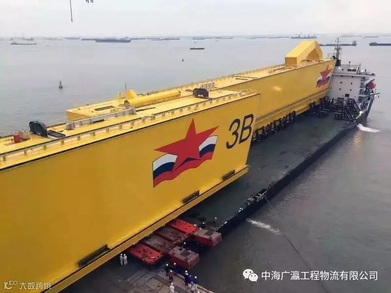 持续时间:2017年4月—6月,起重能力1200t的 龙门吊自重6000多吨,其构件分段直接从建造场地滚装上船海运到俄罗斯海参崴滚卸上岸并在指定位置就位,最大分段重量达2400吨。