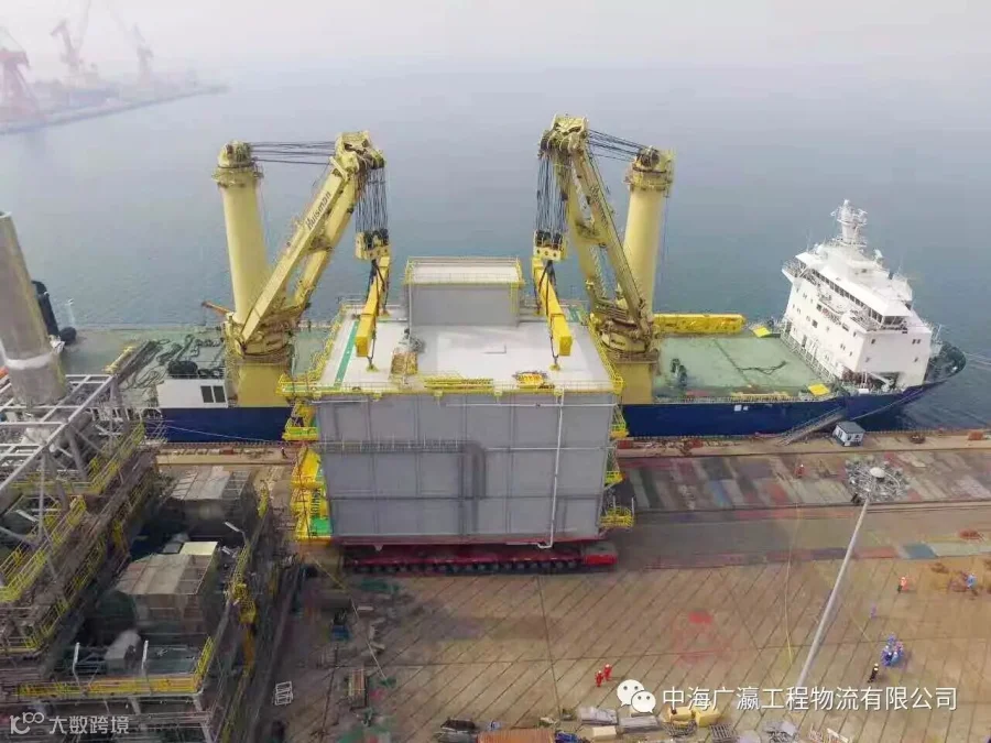 项目难点:建造工地狭小,模块重量重,我司技术人员通过详实的计算方案,与船东及业主密切沟通,最终设计获得业主方审核批准并顺利完成了此次高难度的吊运一体化作业。