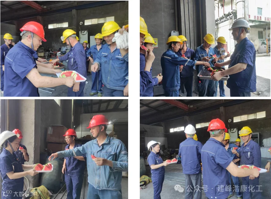 建峰浩康领导班子成员分别深入甲醛、树脂、六羟装置“战斗一线”现场,对不惧酷暑、高温天气下依然坚守岗位的职工表示敬意并送上冰冻西瓜和绿豆汤。叮嘱一线人员要把安全放在首位,认真落实夏季高温天气安全生产防范措施,外出作业标准穿戴安全防护,确保安全、生产两不误。