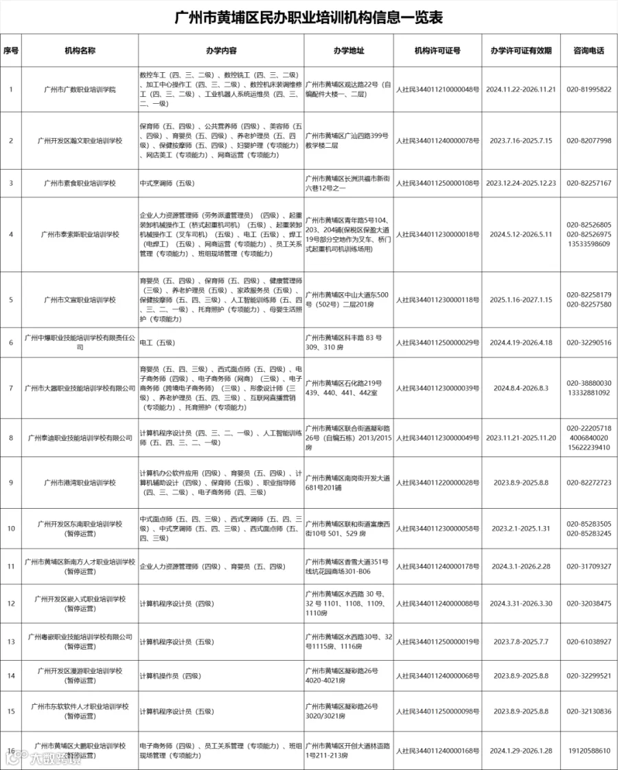 广州市黄埔区民办职业培训机构一览表(20250108,16家).xlsx