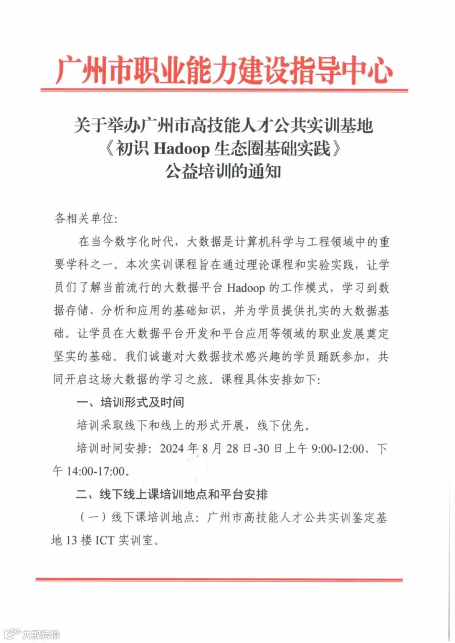 关于举办广州市高技能人才公共实训基地《初识Hadoop生态圈基础实践》公益培训的通知