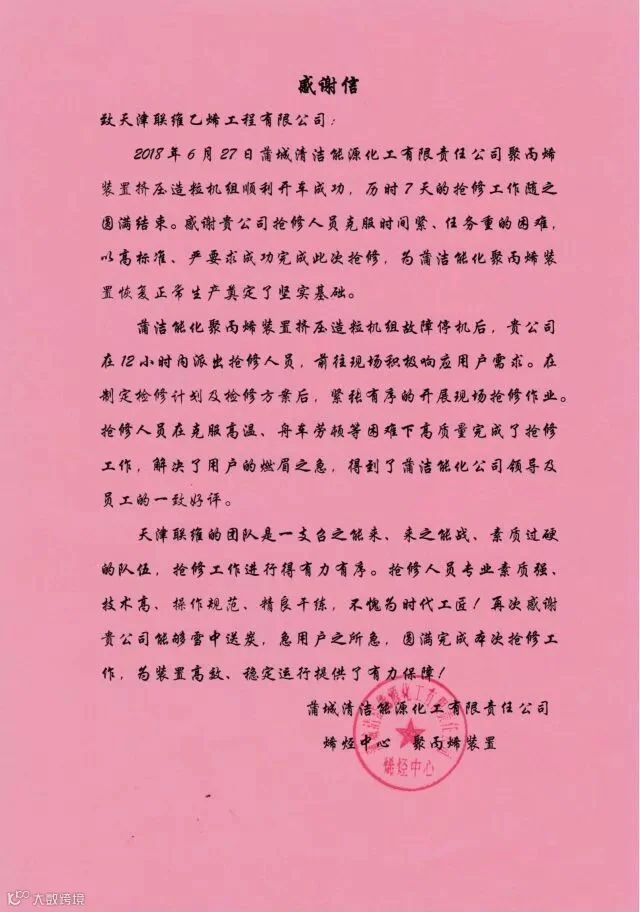 近日来,我公司多次收到客户发来的感谢信,充分肯定了我公司及时、专业的技术服务。7月6日公司再次收到蒲城清洁能源化工有限责任公司发来的感谢信,高度赞扬了我公司在聚丙烯装置挤压造粒机组抢修人员出色的工作表现和敬业精神,对我公司提供的优质高效的技术服务表示由衷的感谢!
