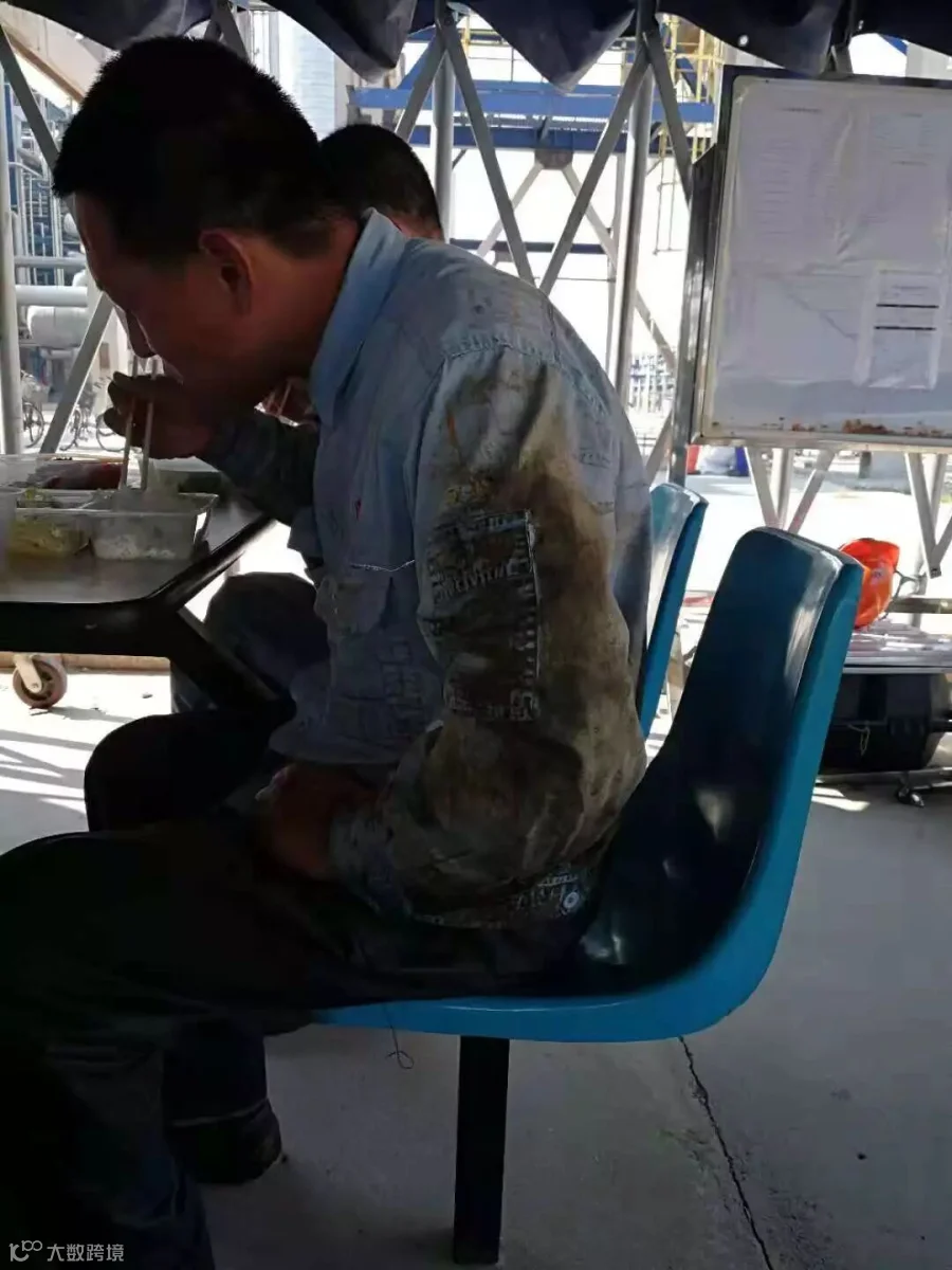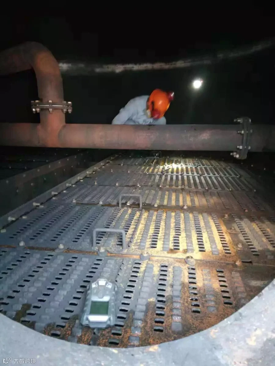 如果说EA154抢修是一场硬仗,那C710塔抢修绝对称得上是一场恶战。那C710塔又是个啥?如果EA154换热器像个鼻子,那C710塔就像个烟囱。只不过这个烟囱内部有一层一层像筛子一样的板子,用专业术语叫塔盘。由于塔盘孔洞被结焦物堵住,导致进入内部的气体无法满足工艺条件,影响装置生产,如不及时清理甚至有停车风险。这回我们的任务就是将C710塔内共58层的塔盘以及周围塔壁清理干净。