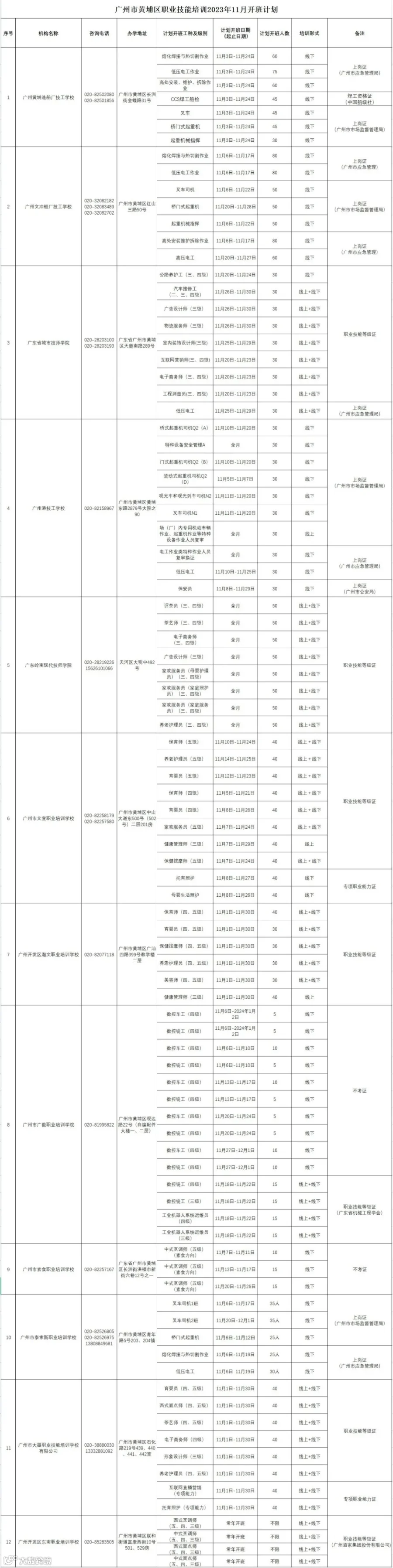 广州市黄埔区职业技能培训2023年11月开班计划通知