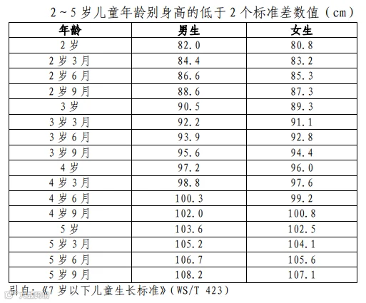 ● 2~5岁儿童身高低于同年龄、同性别儿童身高2个标准差则判定为生长迟缓: