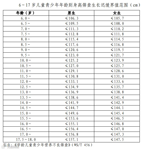 ● 6~17岁儿童青少年身高小于或等于相应年龄组、性别生长迟缓界值范围则判定为生长迟缓: