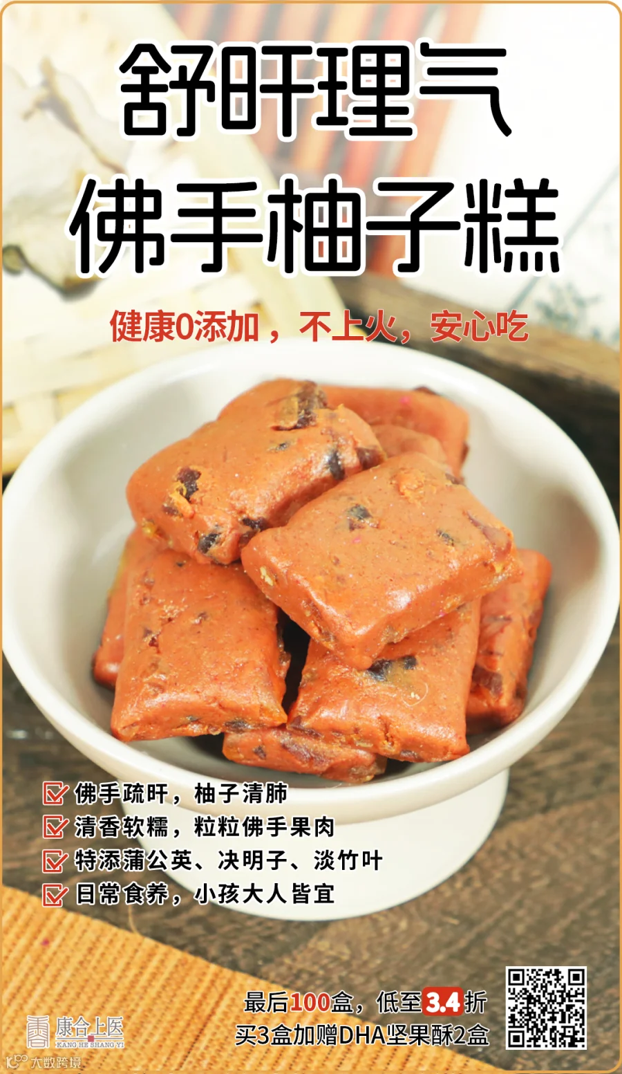 佛手柚子糕科学配伍佛手、柚子、橙皮、雪梨、胡萝卜、银耳、蒲公英、决明子、淡竹叶等11味食材,春季调理小糕点,老少皆宜。