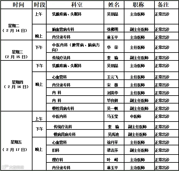 【2月13日-2月19日】康合上医门诊部专家出诊时间表 康合上医