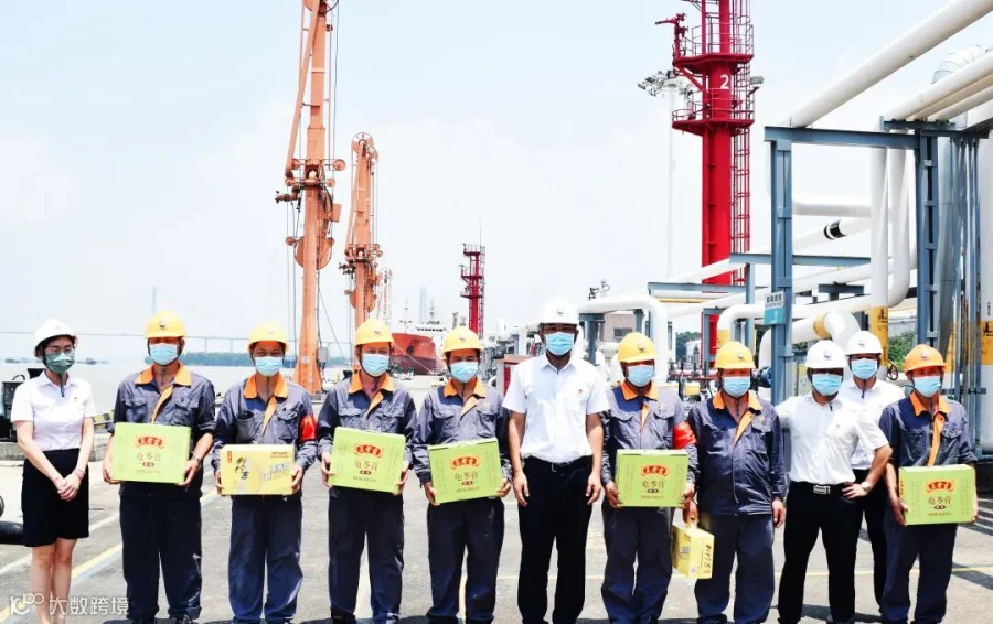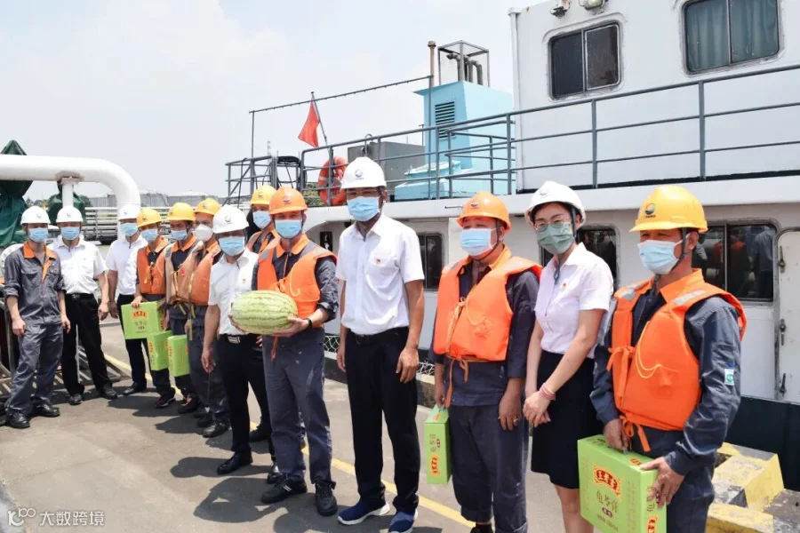 公司领导班子深入码头前沿,走访慰问在烈日炎炎下作业的装卸工人及船员等,为他们送上王老吉、菊花茶、西瓜等清凉饮料和水果,用清凉的“绿色”表达出对一线工人的关心关爱。
