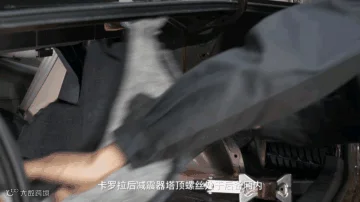 卡罗拉后减震器塔顶螺丝处于后备箱内,在拆装时要注意使用千斤顶来托住后悬架以防止弹簧脱落。