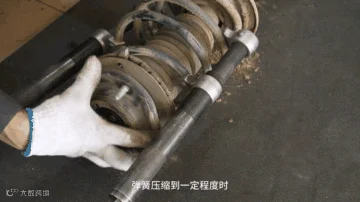 使用专业的器材(弹簧压缩机或卷式弹簧拆卸工具)拆卸减震器总成。压缩弹簧时,注意要选择对角的位置压缩弹簧,可避免弹簧因受力不均匀而造成事故。