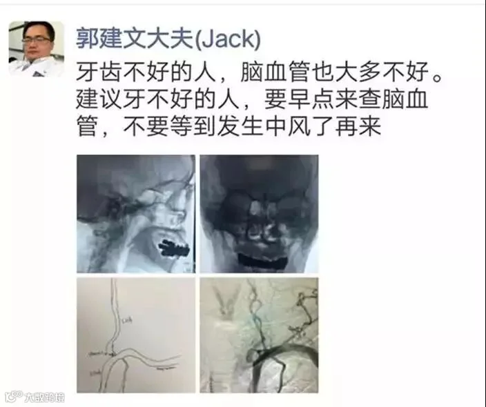 但是医生们发现,临床上很多心脑血管狭窄的病人,普遍牙齿状况也不太好,牙周炎严重程度越高,患缺血性脑卒中的风险就越高。在一项711名平均年龄为66且没有中风或心肌梗死病史的受试者观察中,牙齿脱落水平与颈动脉斑块患病率显著相关。
