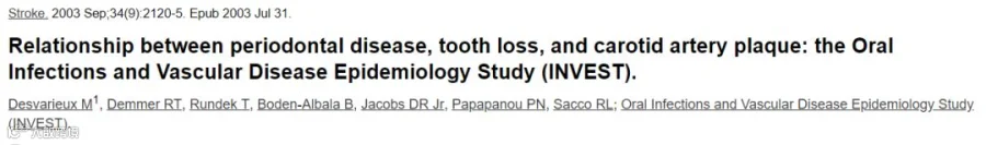 2003年发表在权威期刊《stroke》的一项研究显示,在711名平均年龄为66±9且没有中风或心肌梗死病史的受试者观察中,牙齿脱落水平与颈动脉斑块患病率显著相关。其中牙齿丢失个数在0-9颗的受试者,46%有颈动脉斑块;牙齿丢失个数≥10的受试者约有60%患有颈动脉斑块。颈动脉健康状况被认为是全身血管的健康状况的“晴雨表”,是颈动脉粥样硬化的表现,目前认为与老年人缺血性脑卒中的发生密切相关。