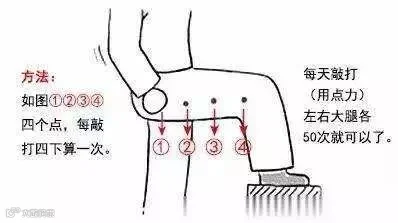 拍打胆经。由髋部到双膝,顺着大腿外侧中线,由上往下拍打,每日1~2次,每次20分钟左右。