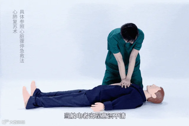 当触电者出现意识不清,且呼吸及脉搏停止时,应立即对其行心肺复苏术,并拨打急救电话120,直到医护人员赶到。