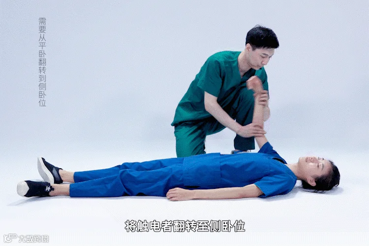 当触电者意识不清,但呼吸及脉搏正常时,需要将触电者翻转至侧卧位。以右侧卧位为例,抬起触电者右胳膊,放在头的一侧,将其左手放在右肩上,左腿屈曲,施救者双手分别放在触电者左肩及左膝,翻转其至右侧卧位。翻转后需注意观察触电者意识、呼吸及脉搏等情况,如触电者口腔有分泌物,应及时处理,防止窒息。