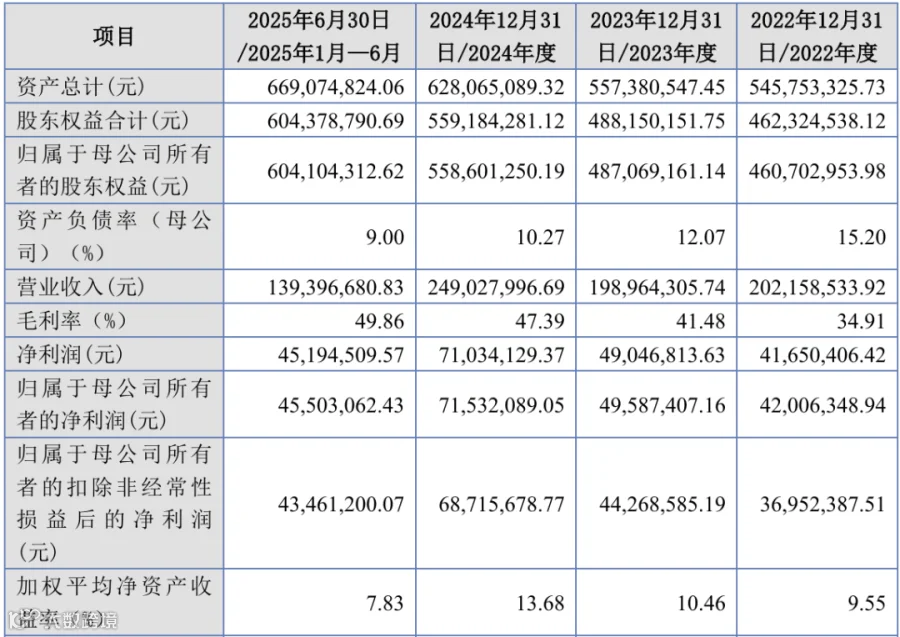 盈利端表现亮眼,营收在 2023 年小幅回落后,2024 年回升至 2.49 亿元,2025 年上半年达 1.39 亿元,进度超预期;毛利率从 34.91% 持续攀升至 49.86%,产品盈利能力显著增强。