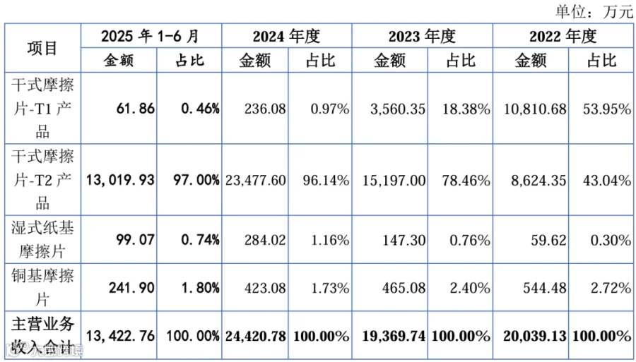 产品结构呈现鲜明的优化趋势,T2 干式摩擦片占比从 2022 年的 43.04% 飙升至 2025 年上半年的 97%,成为绝对营收支柱,战略聚焦成效一目了然;湿式纸基摩擦片、铜基摩擦片等产品占比保持稳定,形成补充。