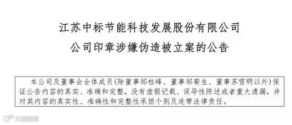 澎湃新闻注意到,在中标科技发布的公司印章涉嫌伪造被立案的公告首部则郑重声明,公司及董事会全体成员(除董事邹柱峰、董事邹菊生、董事苏雪明以外)保证公告内容的真实、准确和完整。