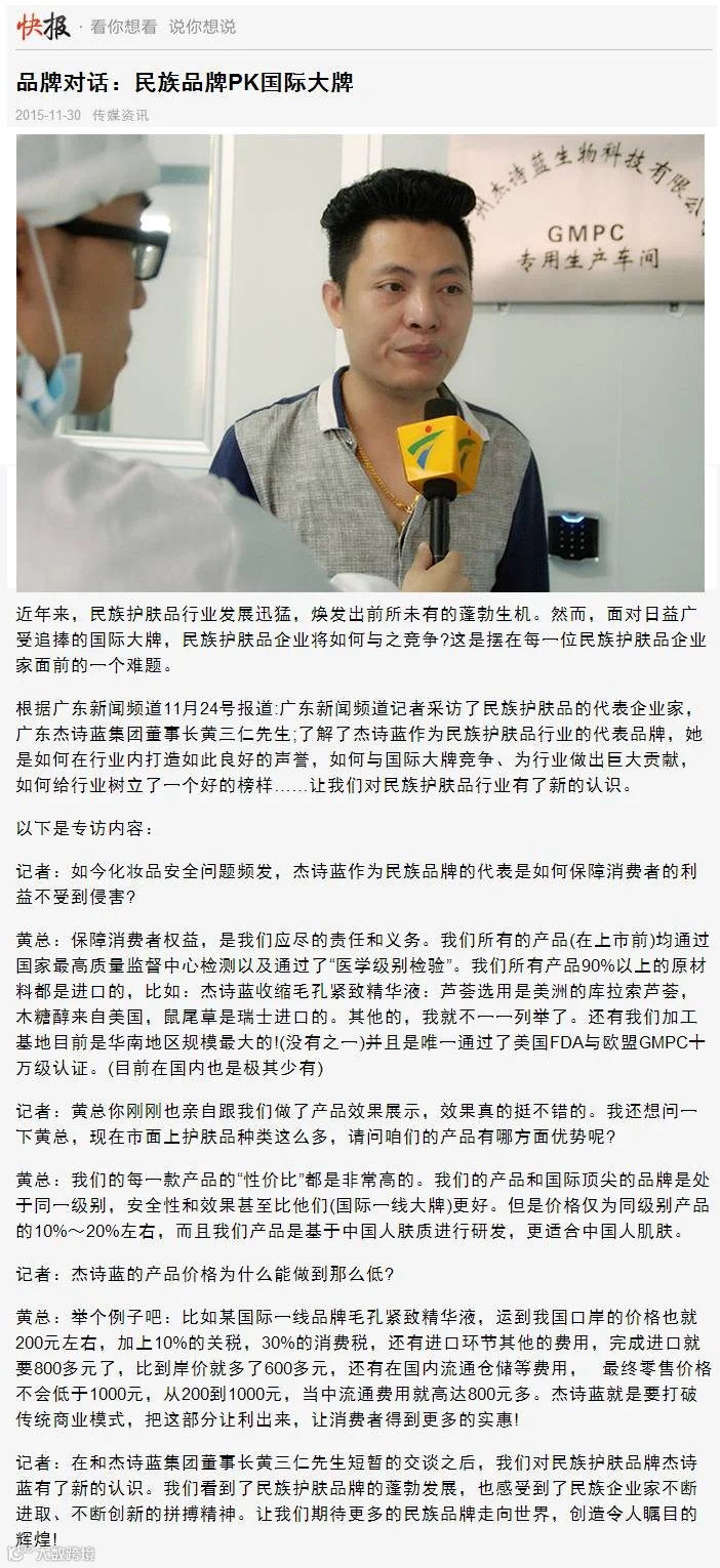 根据广东新闻频道11月24号报道:广东新闻频道记者采访了民族护肤品的代表企业家,广东杰诗蓝集团董事长黄三仁先生;了解了杰诗蓝作为民族护肤品行业的代表品牌,她是如何在行业内打造如此良好的声誉,如何与国际大牌竞争、为行业做出巨大贡献,如何给行业树立了一个好的榜样……让我们对民族护肤品行业有了新的认识。
