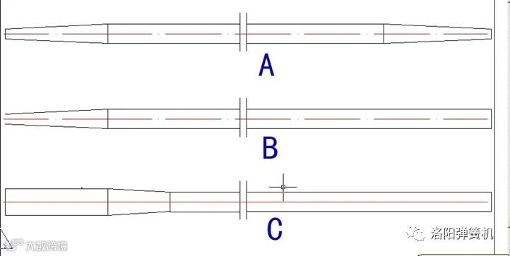 C型弹簧钢丝单端逐渐变粗(也有两端的)采取复杂的墩粗工艺来实现,其制造成本猛增,例如Audi 100轿车前悬架弹簧便是如此。其目的在于提高端圈的刚度,避免端圈与邻圈接触后(在A点)增加额外的接触应力,引起应力集中,从而降低弹簧的疲劳寿命,见图2。