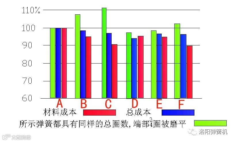 弹簧端部型式是个重要因素,汽车行驶时,弹簧端部相对支承产生转动,常会产生不愉快的噪音。弹簧托盘的适当形状,可保证切成直角的弹簧端头相对支承不动,C类弹簧总成本最低,弹簧端并紧并磨削成平面是比较昂贵的结构型式(A型),以A型为基准,定义它为100%,对其它结构型式进行成本