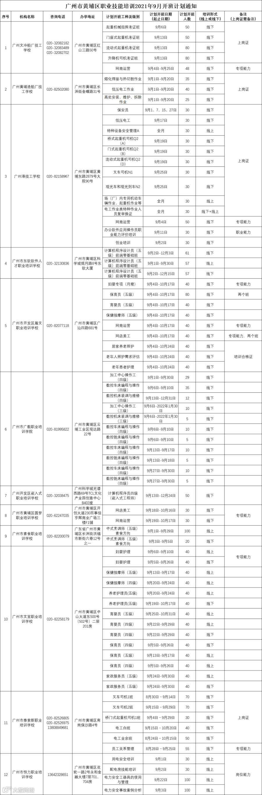 广州市黄埔区职业技能培训2021年9月开班计划通知