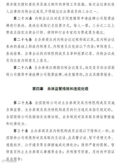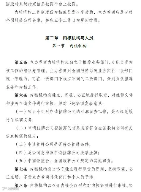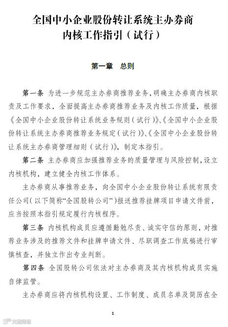 “为进一步规范主办券商推荐业务,明确主办券商内核职责及工作要求,全面提高主办券商推荐业务及内核工作质量,根据《全国中小企业股份转让系统业务规则(试行)》、《全国中小企业股份转让系统主办券商推荐业务规定(试行)》、《全国中小企业股份转让系统主办券商管理细则(试行)》,我司制定了《全国中小企业股份转让系统主办券商内核工作指引(试行)》,现予发布,自2016年10月1日起施行。请各相关机构按照指引要求做好各项准备工作。”