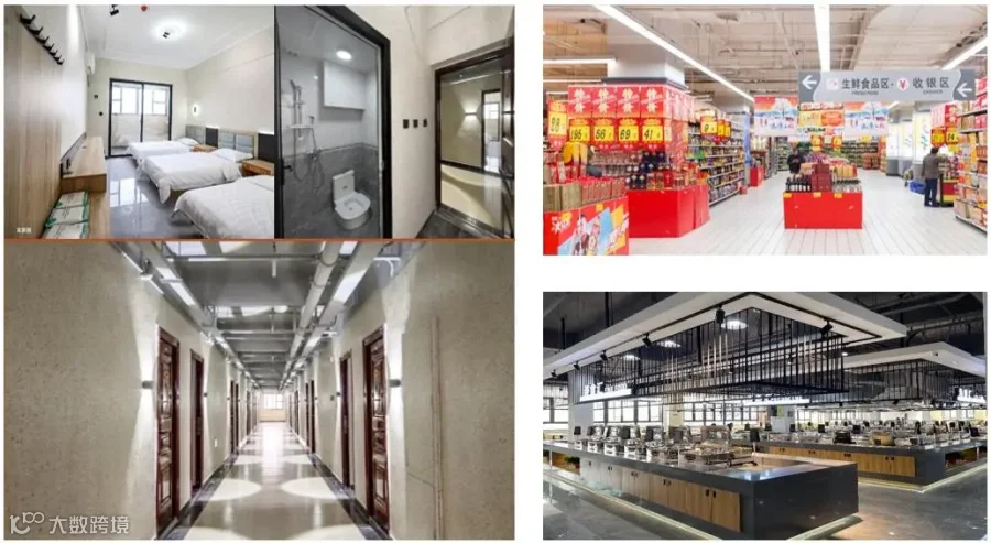 现园区配备现代化员工宿舍,提供多种户型(单人间、双人间、四人间),独立卫浴、空调、24小时热水全覆盖,满足不同层次员工需求;园区内连锁超市,日常生活用品“足不出园”轻松购齐。员工食堂、快餐档口、特色餐饮区提供多样化选择,未来商业配套会陆续完善,给企业和员工提供更多便利。