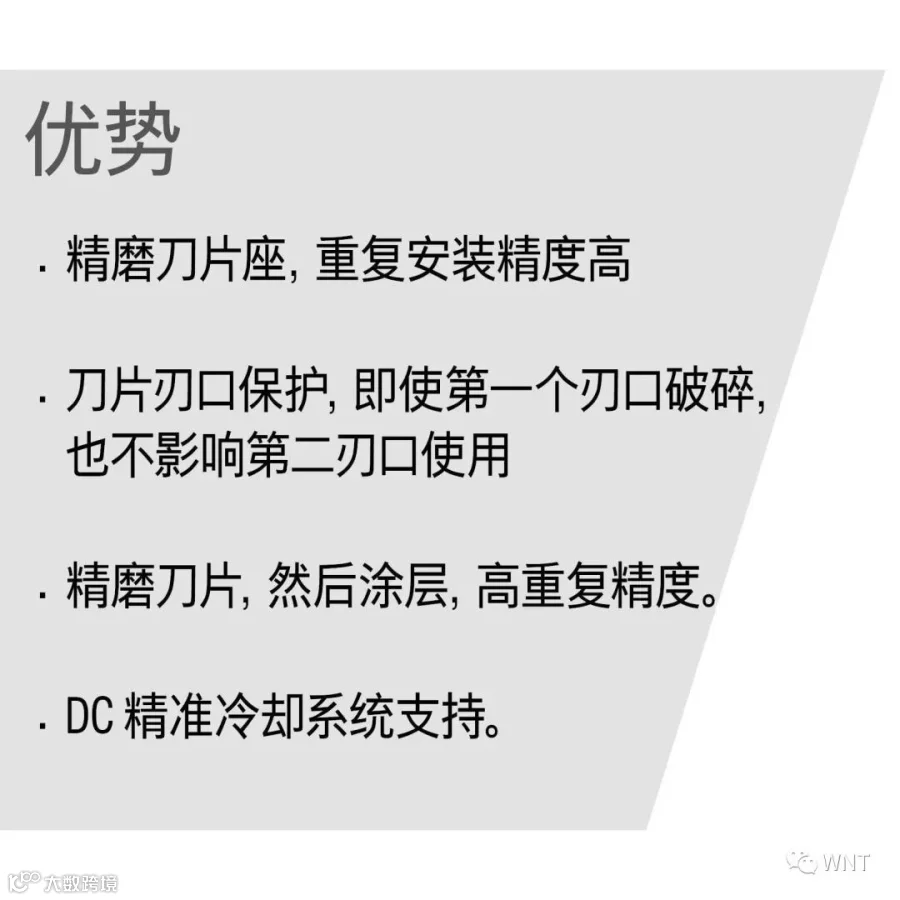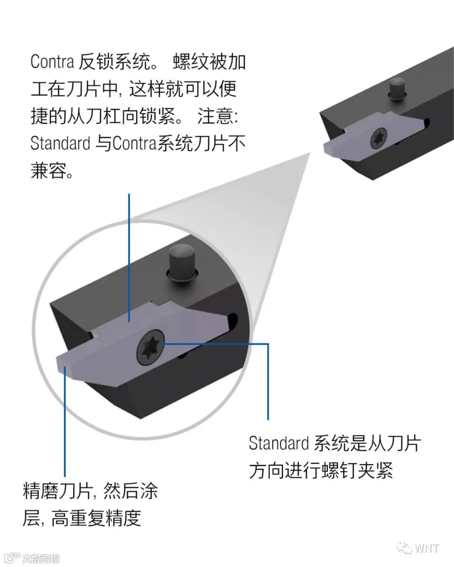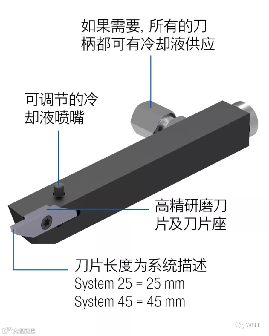 WNT25&45 系统复合刀片座安装系统,此夹持技术保证了切削刃与刀柄表面在一个平面上。刀片可承受三个方向加工切削力,这就意味着该系统可以应用于X,Y轴方向复合加工应用。