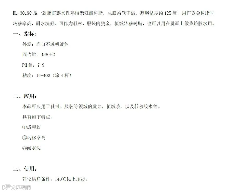 广州市瑞麟新材料有限公司作为行业中的佼佼者,始终致力于开发创新型的材料解决方案。其中,RL-3018C 是公司推出的一款具有代表性的脂肪族水性热熔聚氨酯树脂。该产品以其柔软丰满的成膜效果和约125度的热熔温度,展现出卓越的性能,尤其在烫金树脂应用中表现出高转移率和优异的耐水洗性能,成为鞋材、服装烫金及植绒转移的不二选择。
