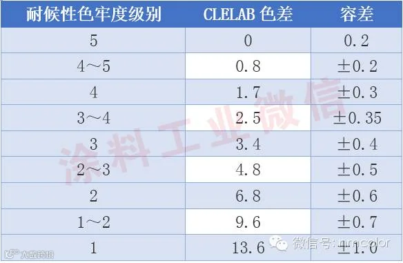 耐候性:使用户外丙烯酸乳胶漆制成1/1和1/25 ISO标准深度色样来进行曝晒。或采用ATLAS人工老化仪暴晒500小时,使用ISO灰卡进行色差评级,1级最差,5级最好。也可以通过分光光度计测量老化前后样板色差来评级。