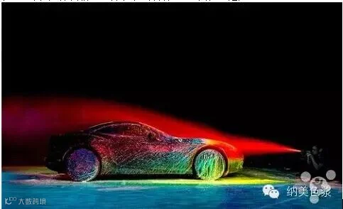 Oefner想出了一种用物质表现速度的方法,他使用的材料是UV霓虹漆。Oefner以每小时241公里的速度朝这辆炫酷的跑车吹风,同时喷上在黑暗中发光的霓虹颜料。他让汽车在保持静止的同时,成功塑造了加速感。