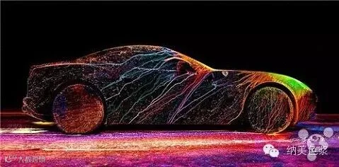 Oefner将此过程拍摄了下来,UV蓝色、粉红色和黄色的条纹沿着汽车流线分布,体现了它运动时候的极速。在此创作过程中,Oefner花了大量时间思考怎样的喷漆才能给大家带来视觉上的震撼,最终的视频表明,他的确震撼到了所有人。