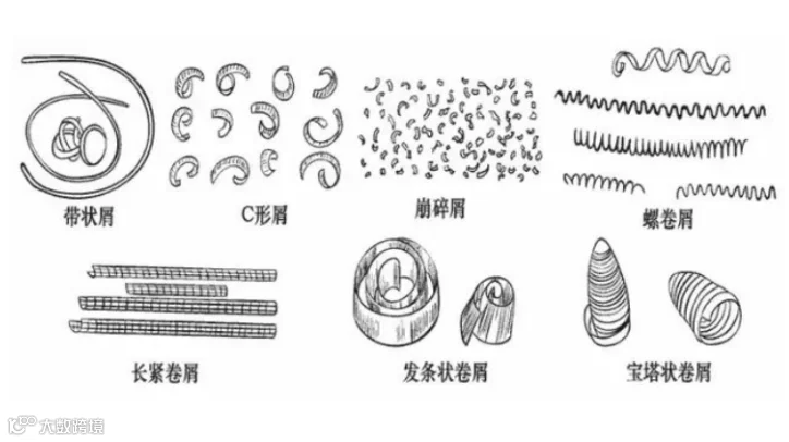 根据工件材料、刀具几何参数和切削用量等的具体情况,切屑形状一般有:带状屑、C形屑、崩碎屑、宝塔状卷屑、发条状卷屑、长紧螺卷屑、螺卷屑等(见图1)。