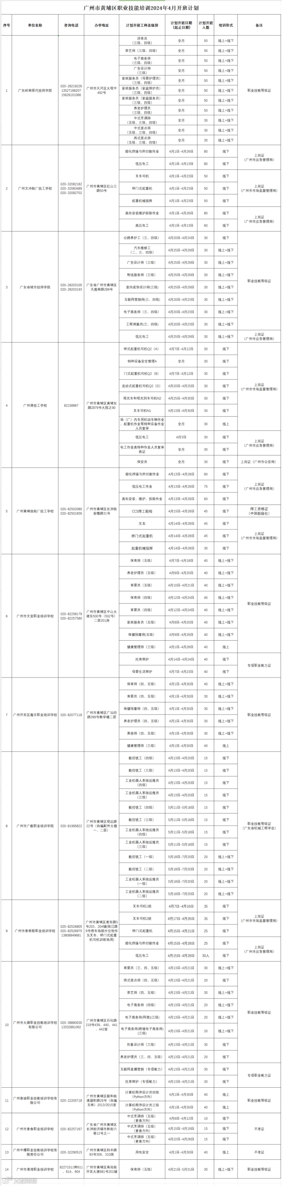 广州市黄埔区职业技能培训2024年4月开班计划通知