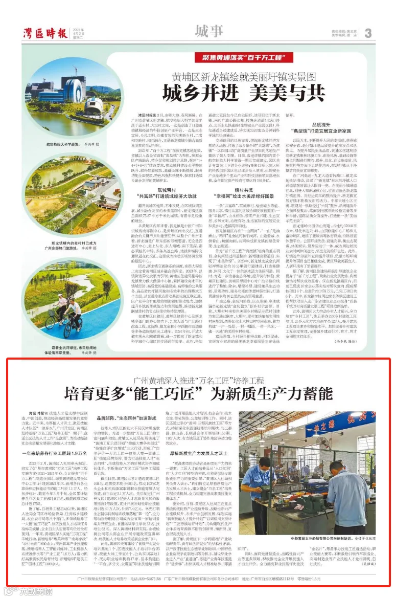 “更高素质的劳动者是新质生产力的第一要素。工匠人才的培养是从‘人口红利’向‘人才红利’转型的关键,也将是加快发展新质生产力的重要引擎。”黄埔区人社局相关负责人表示,“我们将立足厚植新质生产力发展人才沃土,建立健全‘万名工匠’培养工程长效机制,全力构建完善高素质技能支撑体系。”