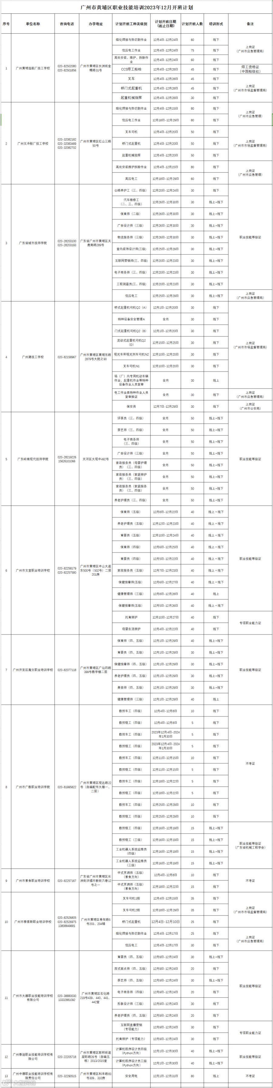 广州市黄埔区职业技能培训2023年12月开班计划通知