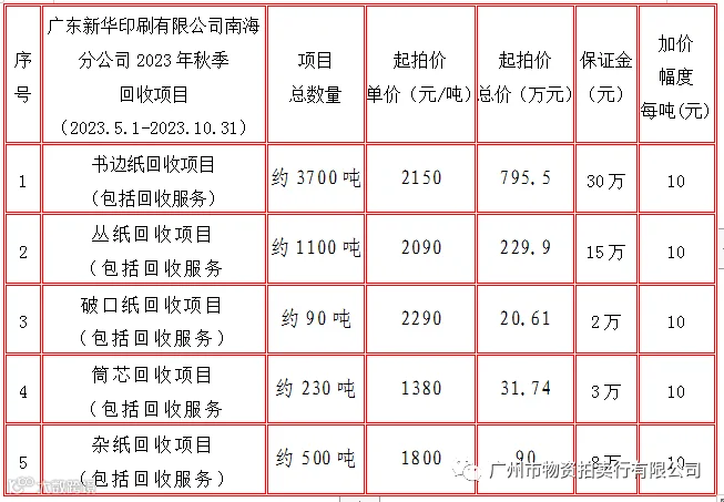 一、拍卖时间及标的:1、2023年4月26日10时拍卖标的1、标的2、标的5(每个竞买人只能竞买标的1书边纸、标的2丛纸、标的5杂纸其中一个标的),标的3破口纸、标的4筒芯回收项目可与其他三种联合竞买。2、2023年4月26日11时拍卖标的3、标的4。