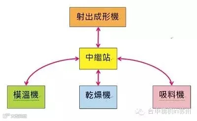 在整合方向、項目確定了就是架構的討論,經過向週邊廠商詢問意願與架構討論先與一家配合此整合專案、也清楚定義出控制架構,即透過中繼通訊介面連接射出成型機與模溫機、乾燥機及吸料機進行啟動、設定與監控,當然也考慮到單獨使用的情況,所以該三項仍保有獨立操控之功能。