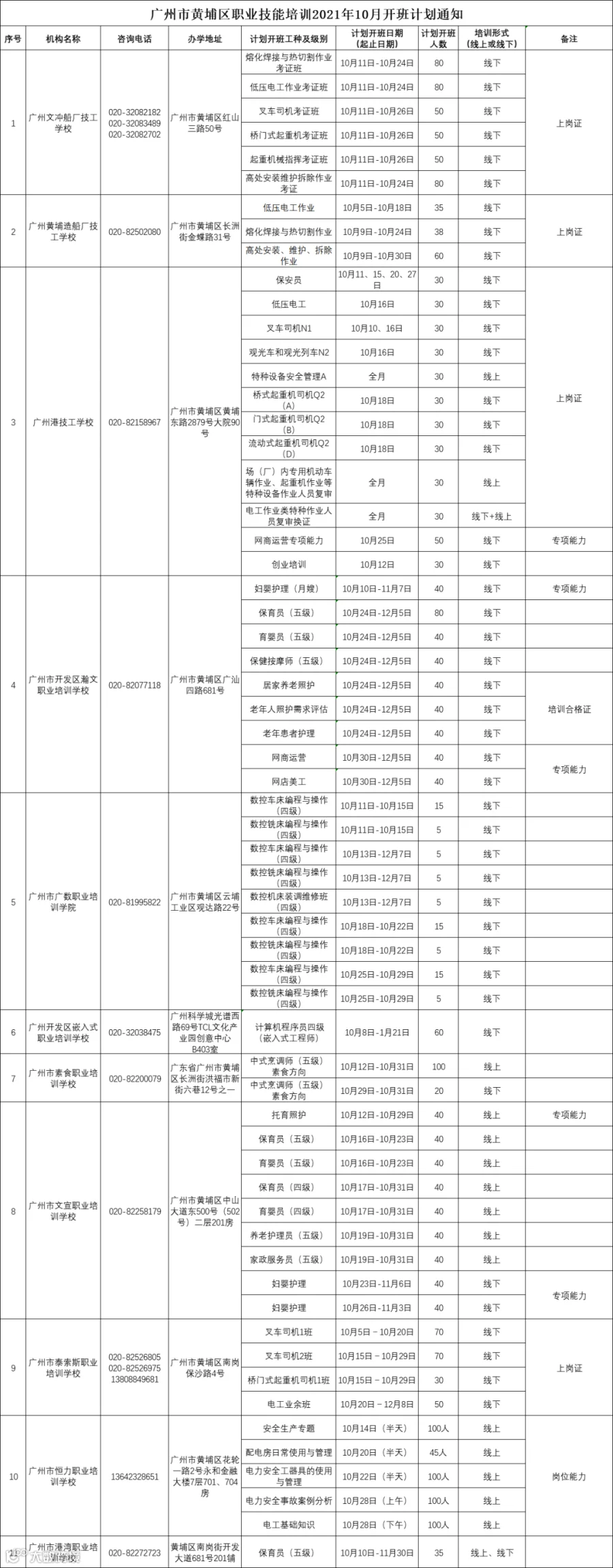 广州市黄埔区职业技能培训2021年10月开班计划通知