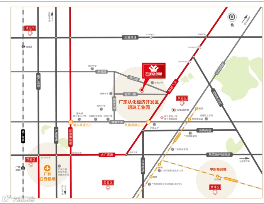 广州(从化)万洋众创城靠近大广高速口、京港澳高速口,距离广州白云国际机场 45分钟车程,企业运输费用经济实惠。