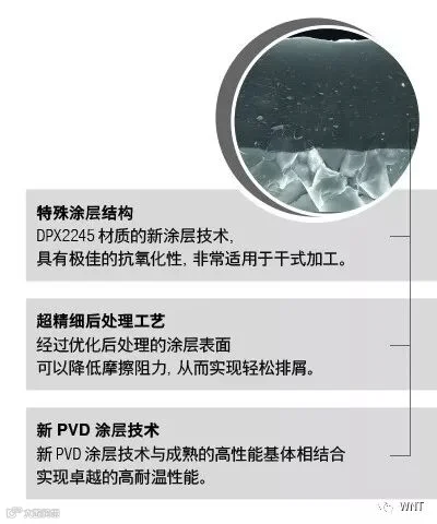此外,DPX2245 集最先进的 PVD 技术与经验证的高性能基材于一身,拥有出色的耐高温性能。使用这种新型材质,客户丝毫无需担心加工安全性和可靠性,同时其极高的韧性也深受青睐。
