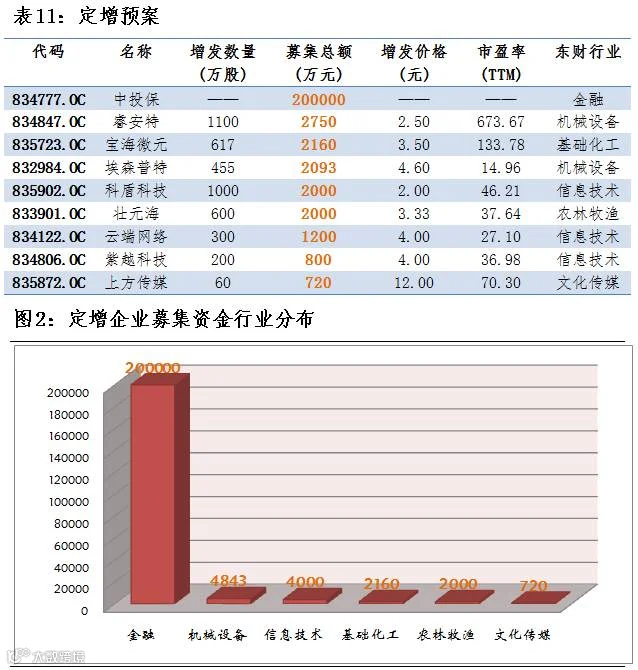 点评:2月23日,共有9家公司公布定增预案,总增发股数4332万股,共募集资金21.3亿元。拟募集资金超过1亿的有1家中投保,募集资金最大为中投保,募集资金20亿元,总体来看,募集金额流向金融。