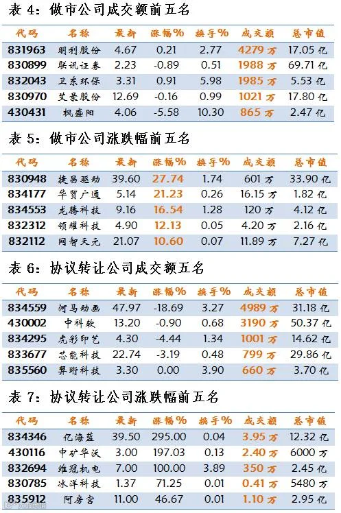 做市企业中有738只个股参与交易,成交额3.41亿元。其中300只个股上涨;4家做市企业成交额破千万,成交额前三名为:明利股份4279万、联讯证券1988万、卫东环保1984万。
