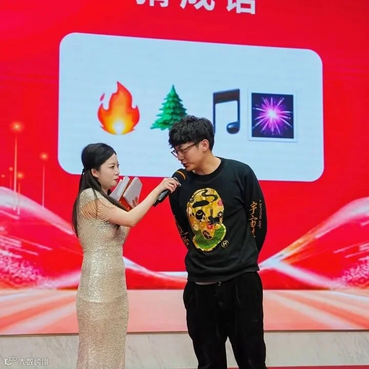年会游戏环节,大家玩“猜成语”。通过图片上的提示猜出成语,大家积极参与迅速猜出成语,气氛轻松愉快,笑声不断。