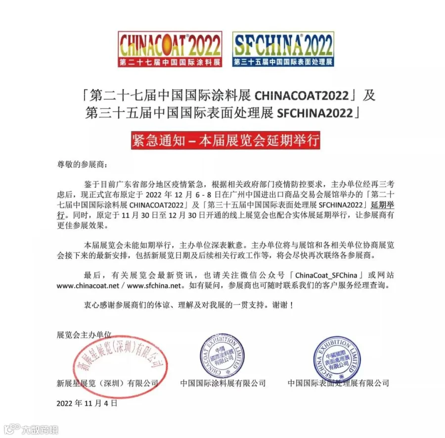 万分遗憾,随着近期全国疫情防控形势趋于严峻,原定于2022年12月6 - 8日在广州中国进出口商品交易会展馆举办的「第二十七届中国国际涂料展 CHINACOAT2022」及「第三十五届中国国际表面处理展 SFCHINA2022」延期举行。同时,原定于11月30日至12月30日开通的线上展览会也配合实体展延期举行。